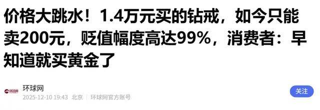 购买钻戒的安徽女子在社交平台分享,如今仅能获得180元的回收价,贬值jnty.com官方网站幅度高达99%。在四川西昌,一位34岁女子发现自己十年前花费14000元购买的两枚婚戒,如今加起来卖不到200元,直言“早知道就买黄金了”。如果时间倒回2012年,当时黄金价格约为每克338元,若花费1.8万元购入黄金,如今约能卖超4.5万元;而同价值的钻石如今只能换回千元左右。