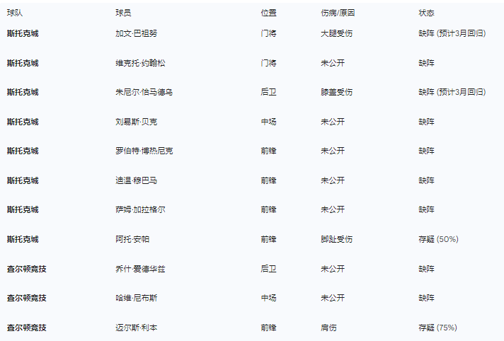足球比赛的结果往往取决于出场人员的完整性以及外部环境的配合。在这场对决中,斯托克城的伤病危机和查尔顿的主场优势构成了分析的核心矛盾。