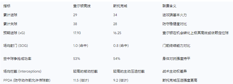 从防守端看,斯托克城的防线更为稳固,场均失球仅为0.9个,远低于查尔顿的1.24个 。斯托克城在PPDA指标上的优势表明,他们更倾向于在前场就通过积极的逼抢夺回球权,从而减轻后防压力。