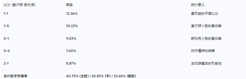 综合所有因素,斯托克城尽管在技术层面占优,但阵容的残缺(尤其是门将和锋线核心的缺阵)使其难以在客场带走三分。查尔顿竞技虽然进攻手段单一,但在保级压力的驱动下,主场战斗力极强。