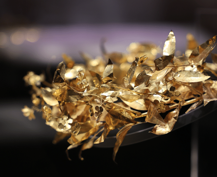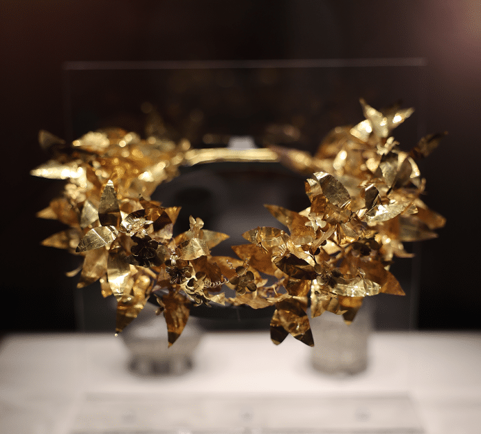 其中不乏令人眼前一亮的展品,比如桃金娘形花冠,实在是太过精美,感觉呼一口气都能让金叶子颤动!