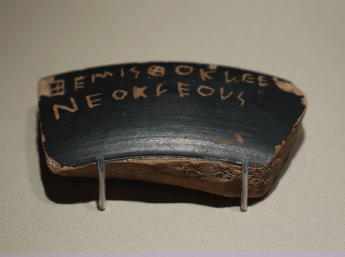 放逐地米斯托克利的陶片 放逐于公元前472年 陶还有放逐地米斯托克利的陶片——历史课本里的 “陶片放逐法”,终于能在这个展览中看到实物,看到的那一瞬间,真的很感动、惊叹!因为历史不再局限于文字!