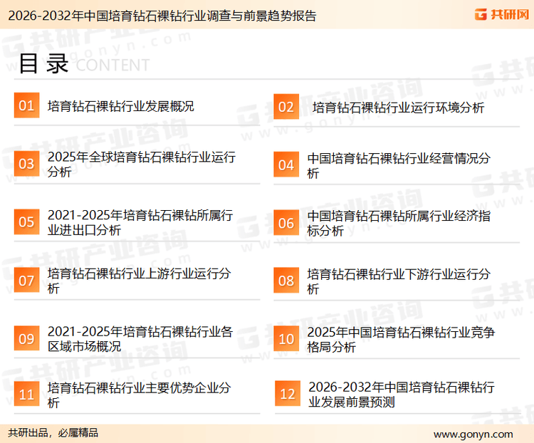 共研网发布的《2026-2032年中国培育钻石裸钻行业调查与前景趋势报告》共十二章。报告首先介绍了培育钻石裸钻行业定义、商业模式、产业壁垒、风险因素、产业特征及研究方法;接着在综合行业PEST环境的基础上对国内外市场培育钻石裸钻产品产销、规模以及价格特征做了重点分析;然后对于培育钻石裸钻行业本身或相关产业的贸易态势、经营状况进行剖析;随后对培育钻石裸钻行业产业链运行环境、区域发展态势、行业竞争格局、典型企业运营等几大核心要素进行了逐个分析;随后报告对培育钻石裸钻行业供需、价格、规模、风险、策略做出来科学严谨的预判。您若想对培育钻石裸钻行业有个系统的了解或者想投资培育钻石裸钻行业,本报告是您不可或缺的重要工具。
