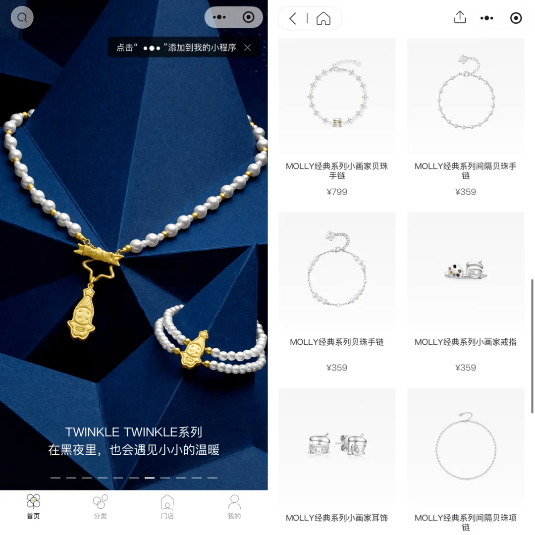 在本次推出足金饰品以前,popop的产品大多采用S925银、贝珠、锆石等这些本身价值不算高的材料,涵盖了LABUBU、HIRONO、MOLLY、SKULL PANDA、TWINKLETWINKLE、星星人等多个热门IP,价格多在319元至2699元之间,基本对标轻奢品牌潘多拉、施华洛世奇等。
