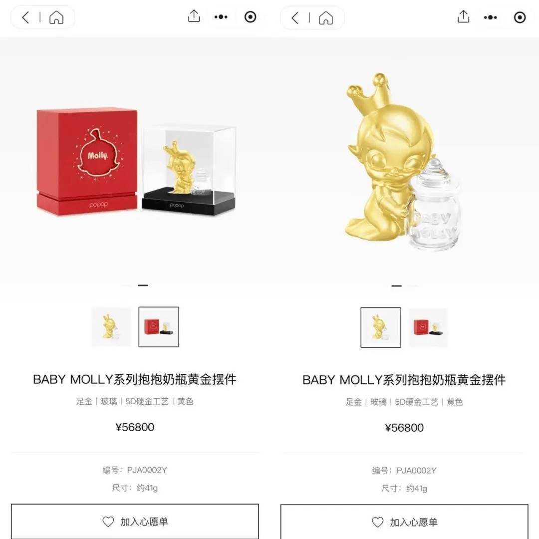 潮新闻记者查询后发现,该系列新品涵盖黄金串珠、吊坠、金条以及黄金摆件等多种品类,价格区间在980至56800元。与老铺黄金一样,popop并未采用传统黄金品牌“金价+加工费”的定价方式,其产品均实行一口价模式,价格不会随实时金价波动而波动。在该系列产品中,单价最贵的是一款重约41g的BABY MOLLY抱抱奶瓶黄金摆件,售价高达56800元。