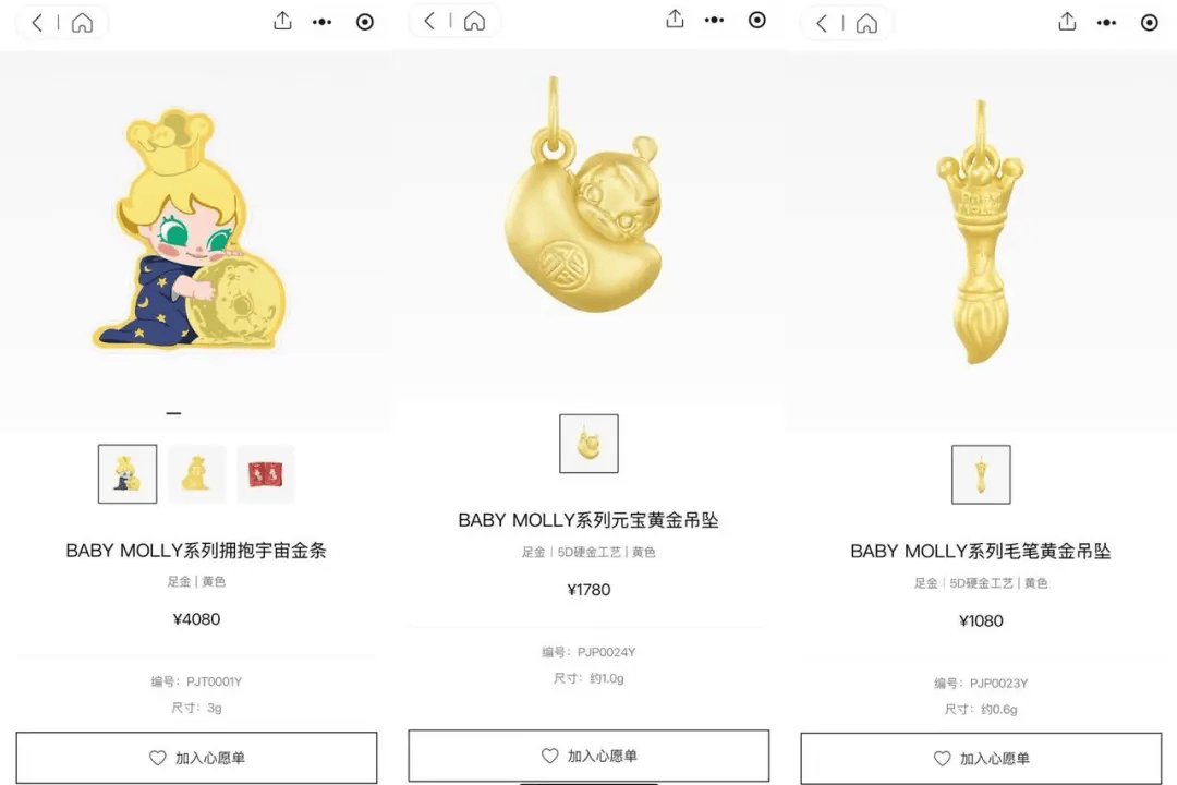 popop小程序显示,根据不同工艺,该足金系列产品的每克单价多集中在1300至1800元之间。具体来看,克重3克的BABY MOLLY系列“拥抱宇宙”金条,售价4080元,折算下来每克价格为1360元;克重1克的元宝黄金吊坠,售价1780元,即每克价格达1780元;克重0.6克的毛笔黄金吊坠,售价1080元,相当于每克价格为1800元。
