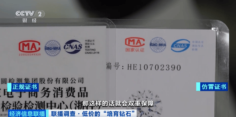 记者调查发现,部分商户还明目张胆表示无需将产品送去鉴定机构,他们自己就能制作鉴定证书。不仅如此,他们还能将假证书编号用激光打在产品腰围上,塑造出钻石的特别标识——腰码。而在网络平台上,各类打着“国家实验室认可”“国家计量认证”等权威标识的证书也仅需几元就能买到。