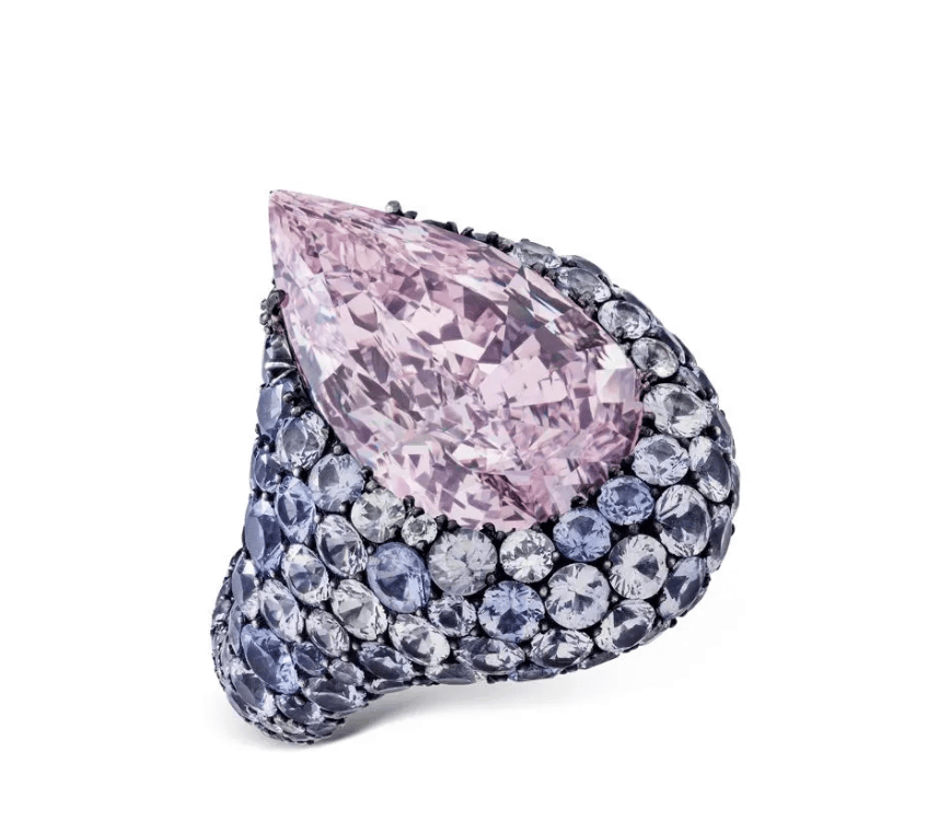 按成交价来看,本次拍卖会排在第二位的是来自国际珠宝大师 JAR的作品——一枚密镶戒指,镶嵌圆形蓝宝石和钻石,中心是伟德国际bv1946一颗 8.68 克拉的紫粉色彩钻。这枚戒指的最终成交价是250万瑞士法郎。