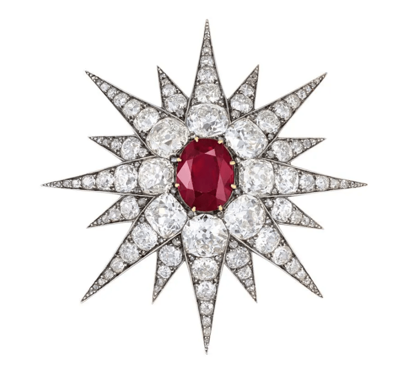 排名第三的拍品是一枚星形吊坠胸针,制作于伟德国际bv1946约 1880 年,中央镶嵌着一颗 10.07 克拉的椭圆形红宝石,并饰有玫瑰切割钻石,成交价228万瑞士法郎。这枚吊坠是第三任斯特德布鲁克伯爵夫人 Helena Violet Alice 继承的几件维多利亚时期珠宝之一。