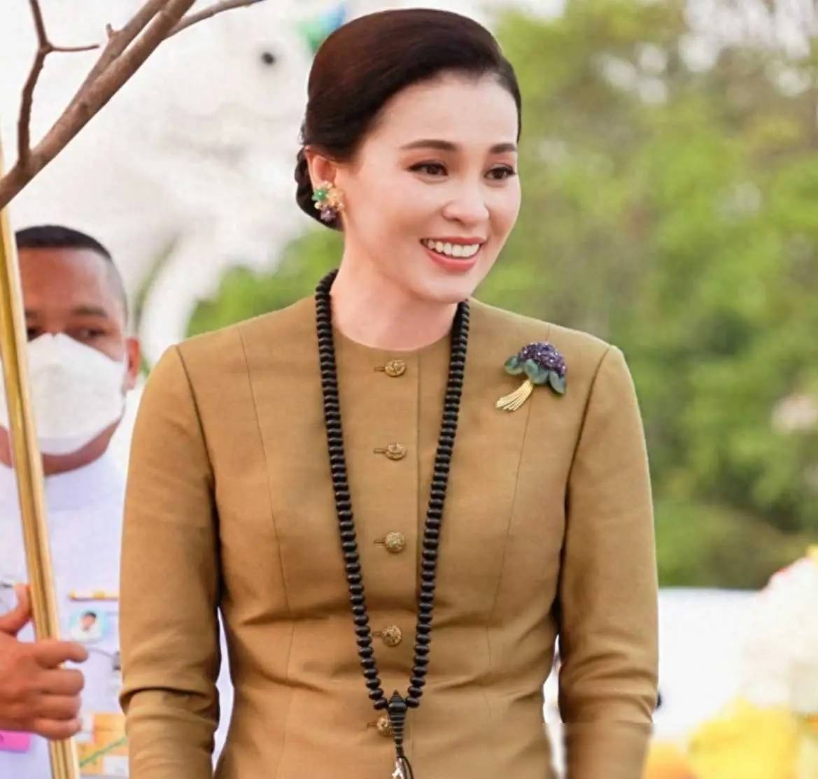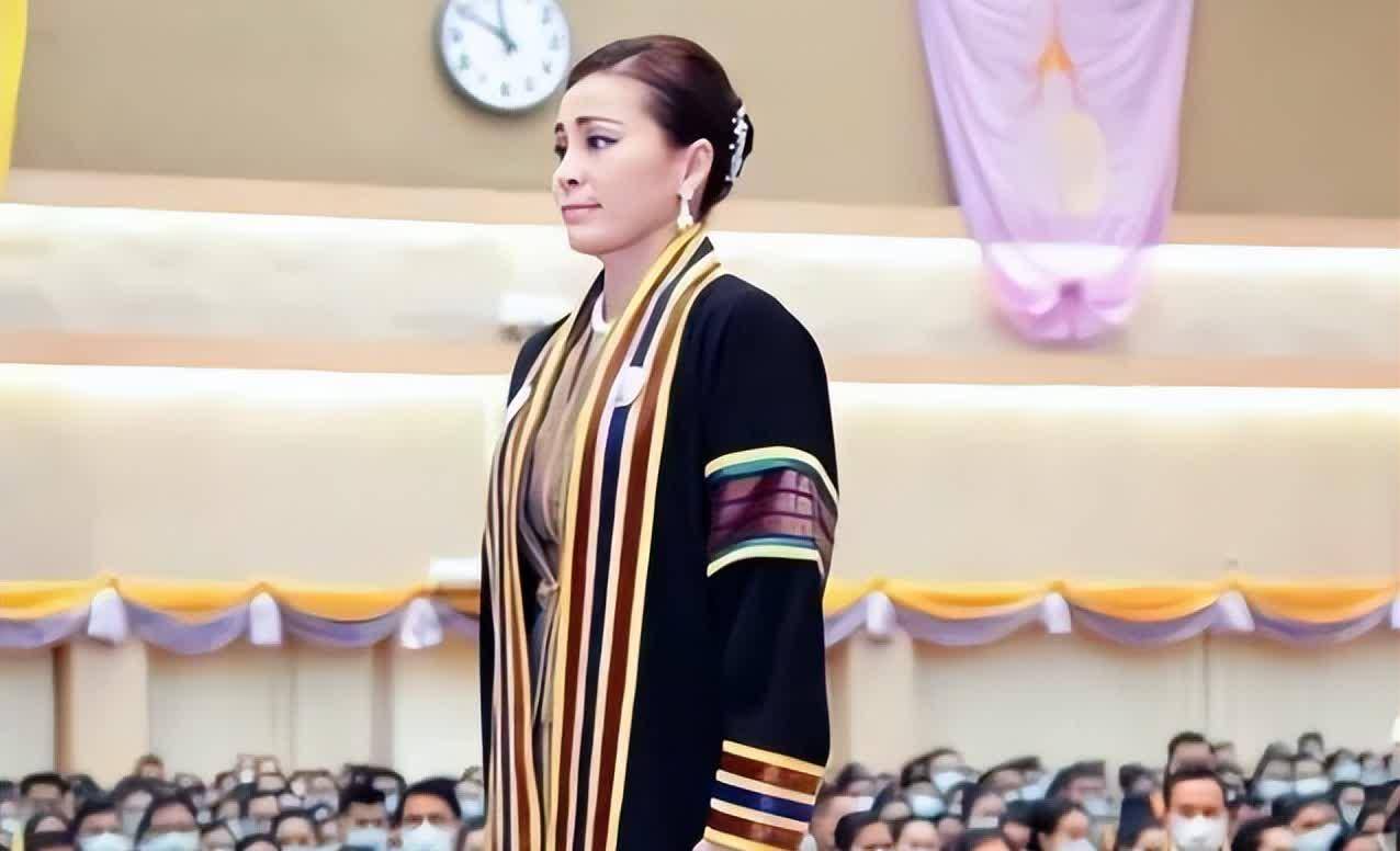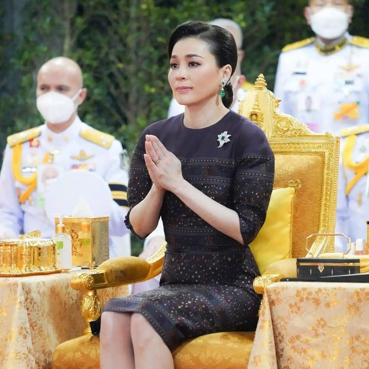 2025年5月,苏提达参加泰王加冕日纪念活动。摄影师拍到她神情严肃地站在大皇宫中,颈间佩戴的蓝宝石项链反射着冷光。