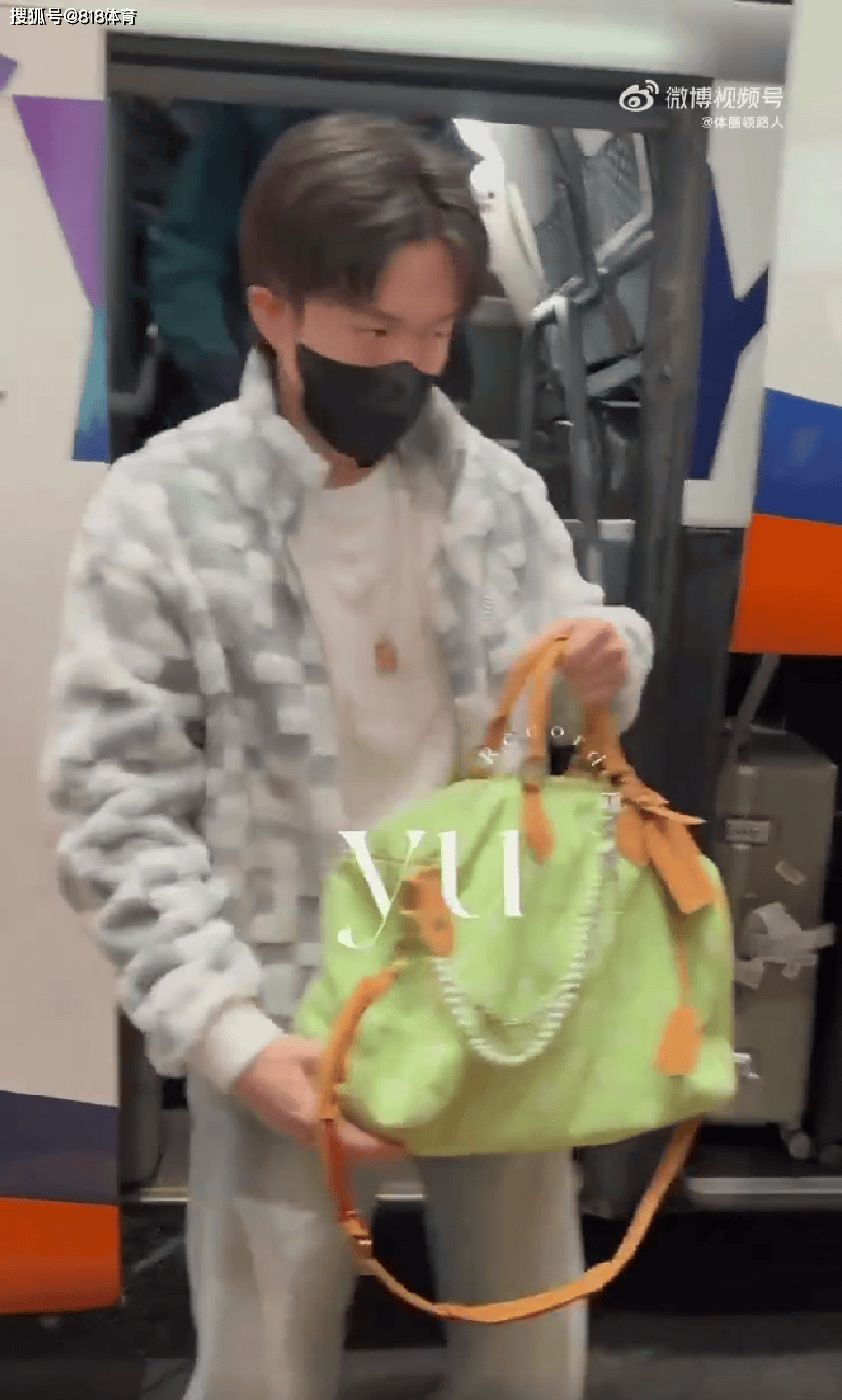 王楚钦梳着小分头,佩戴黑色口罩,两只手各推着一个行李箱,还背着一只LV的绿色包包,气定神闲。