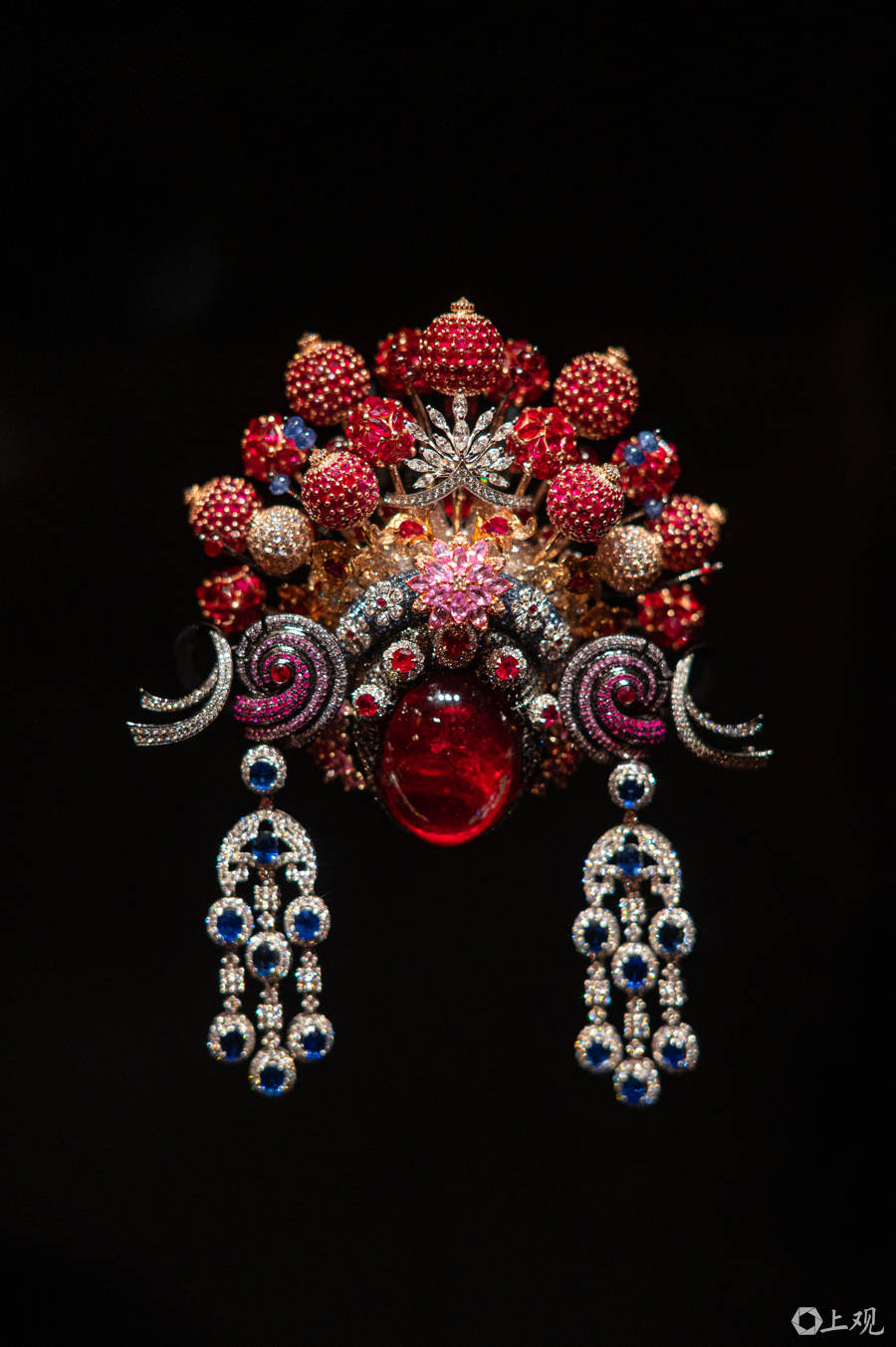 戏曲风格胸针以刀马旦为灵感,84.73克拉碧玺搭配千余颗红宝石,将戏曲艺术的刚柔并济凝于宝石之间。