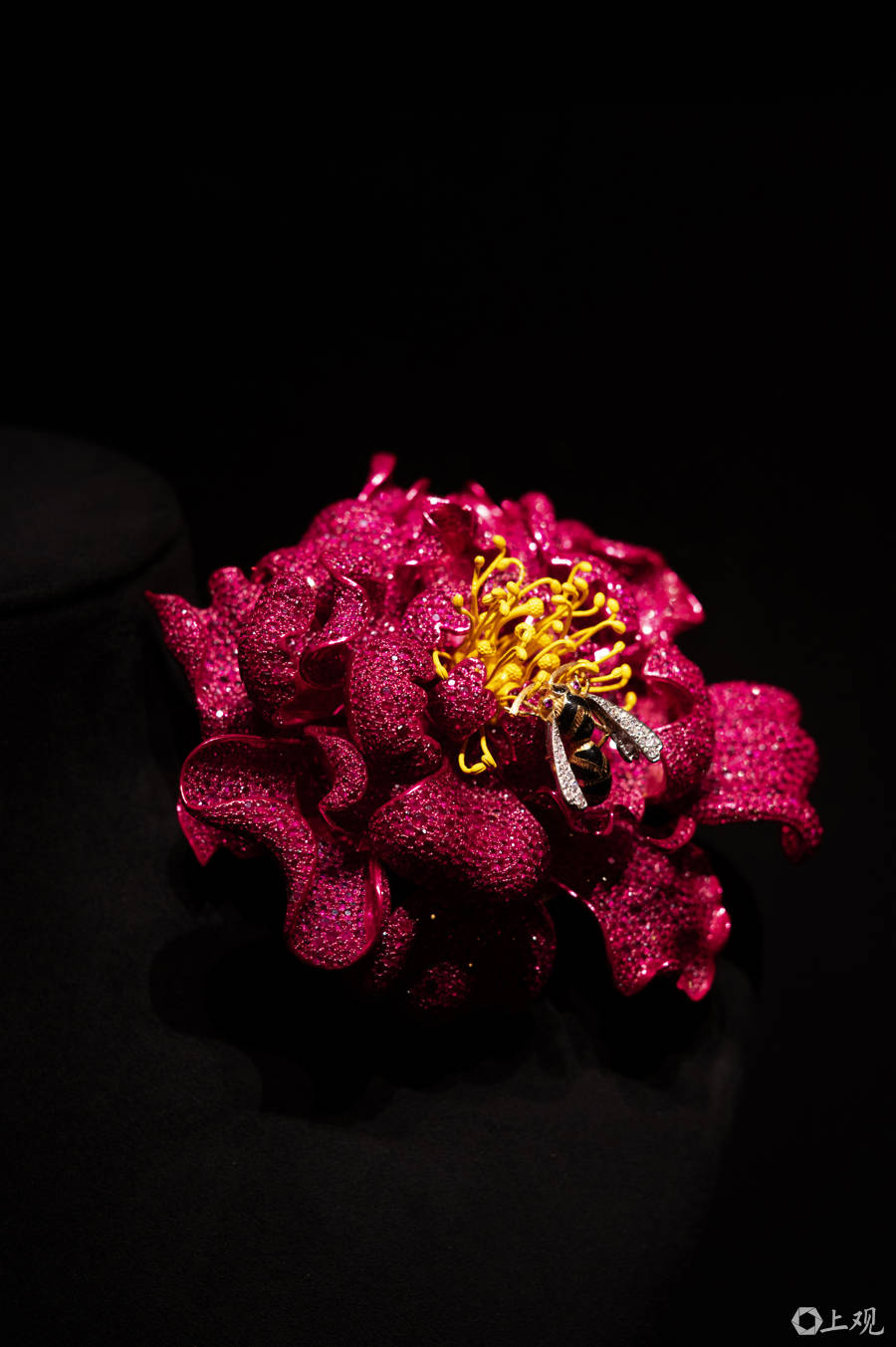 牡丹胸针用8000颗红宝石勾勒牡丹盛放之姿,近2000颗祖母绿雕琢萼片细节。