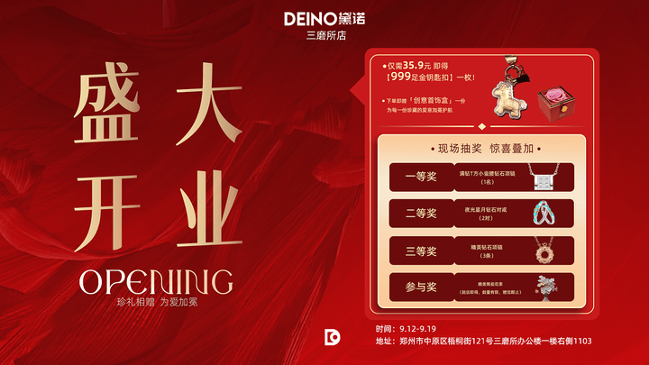 值此开业之际恰逢中秋+国庆双节,DEINO黛诺特别推出“珍礼相赠,为爱加冕”主题系列活动,打造一场融合历史与未来的新店启幕。更有开业特惠,限时尊享以及现场抽奖,惊喜叠加多重惊喜活动,活动时间9月12日—9月19日。以璀璨珠宝传递爱意,为消费者打造独一无二的专属体验。