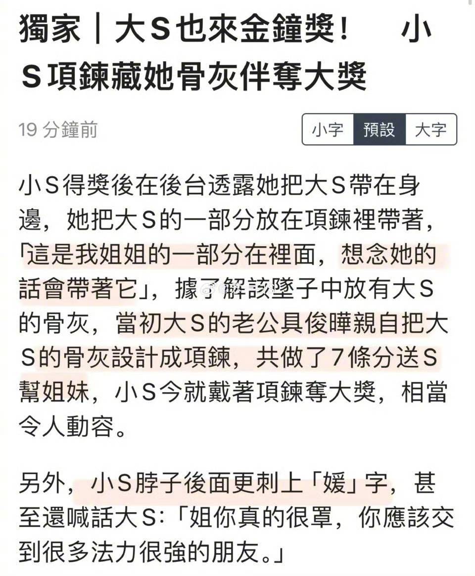 在2025年10月17日的金钟奖颁奖典礼上,小S佩戴了一条黑色心形项链,并亲口证实项链内包含了姐姐大S(徐熙媛)的一部分骨灰。这条项链由大S的丈夫具俊晔设计,经过特殊工艺处理,骨灰被封存在吊坠内。小S解释称,她希望通过佩戴项链,让姐姐陪伴自己出席这一重要时刻,表示想念时会戴上它。