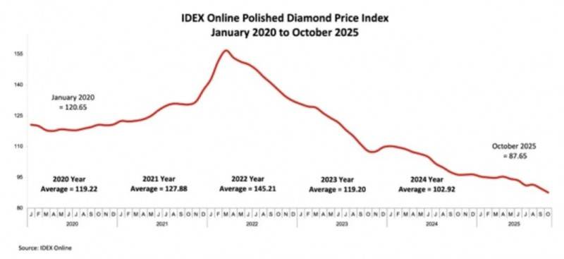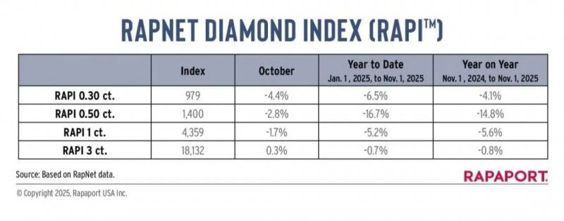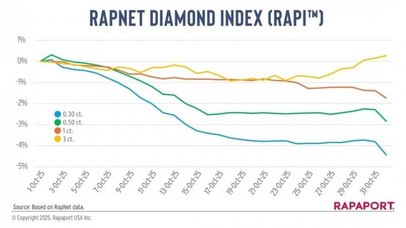 同期发布的IDEX价格报告显示,2025年10月天然钻石综合价格指数下跌幅度为0.48%,较9月的2.08%显著收窄,市场调整力度明显减弱。整个10月期间,除2日前后的短暂波动及29日前后的小幅上涨外,价格指数整体保持平稳运行,日常波动极小。