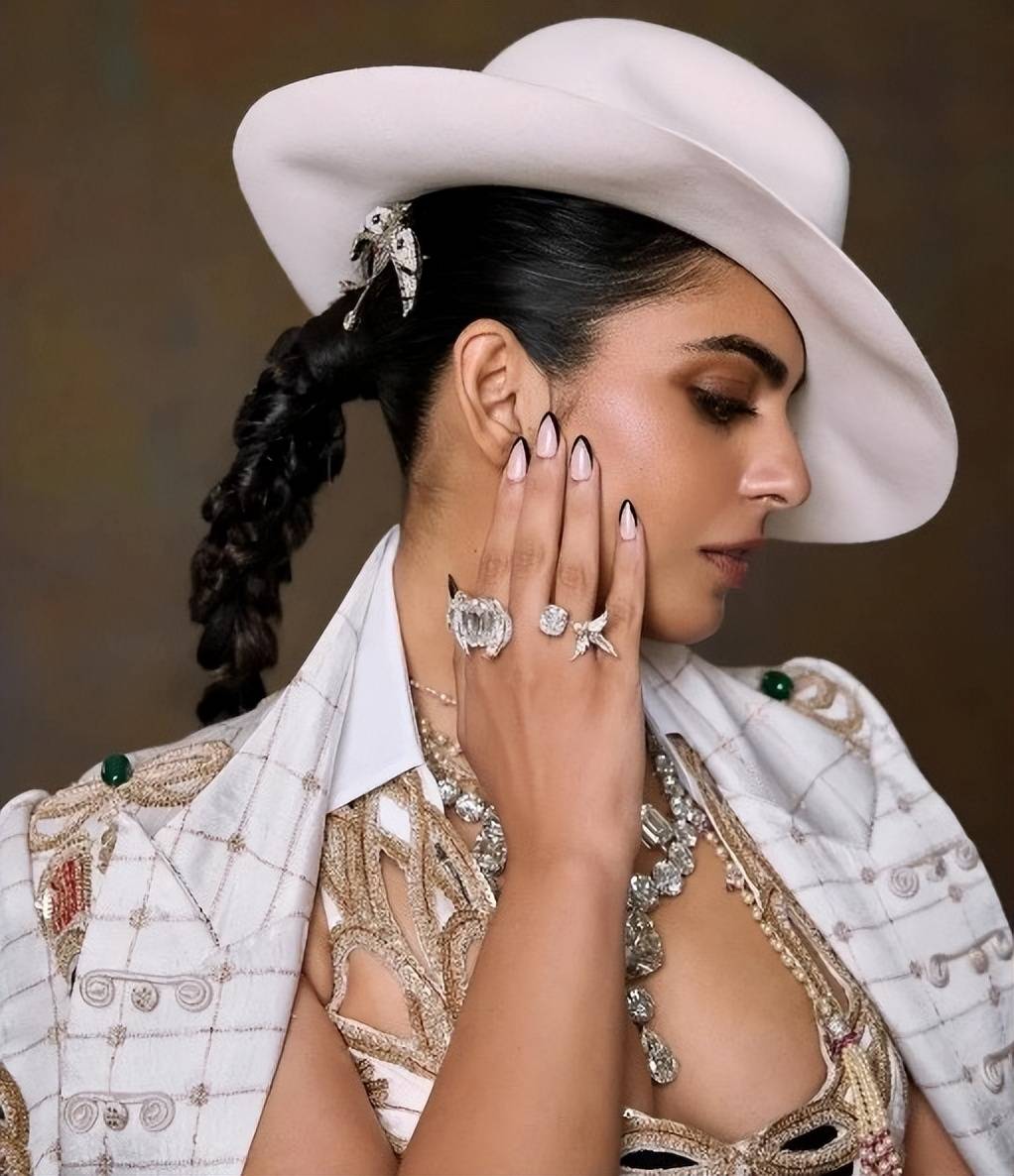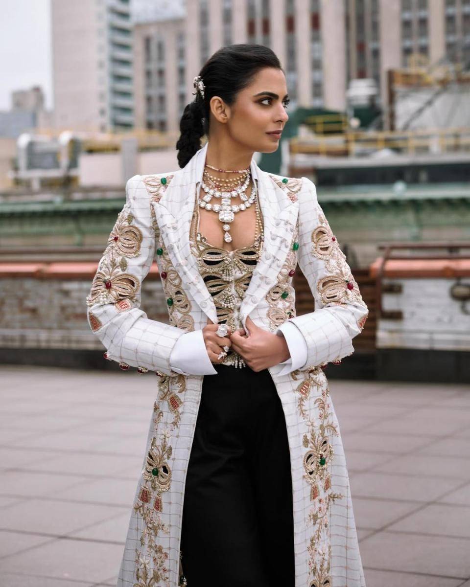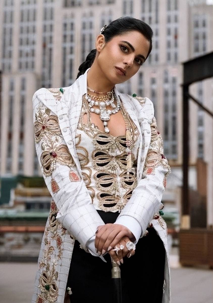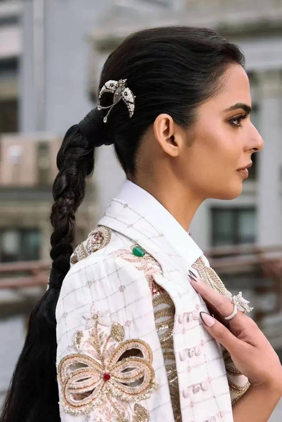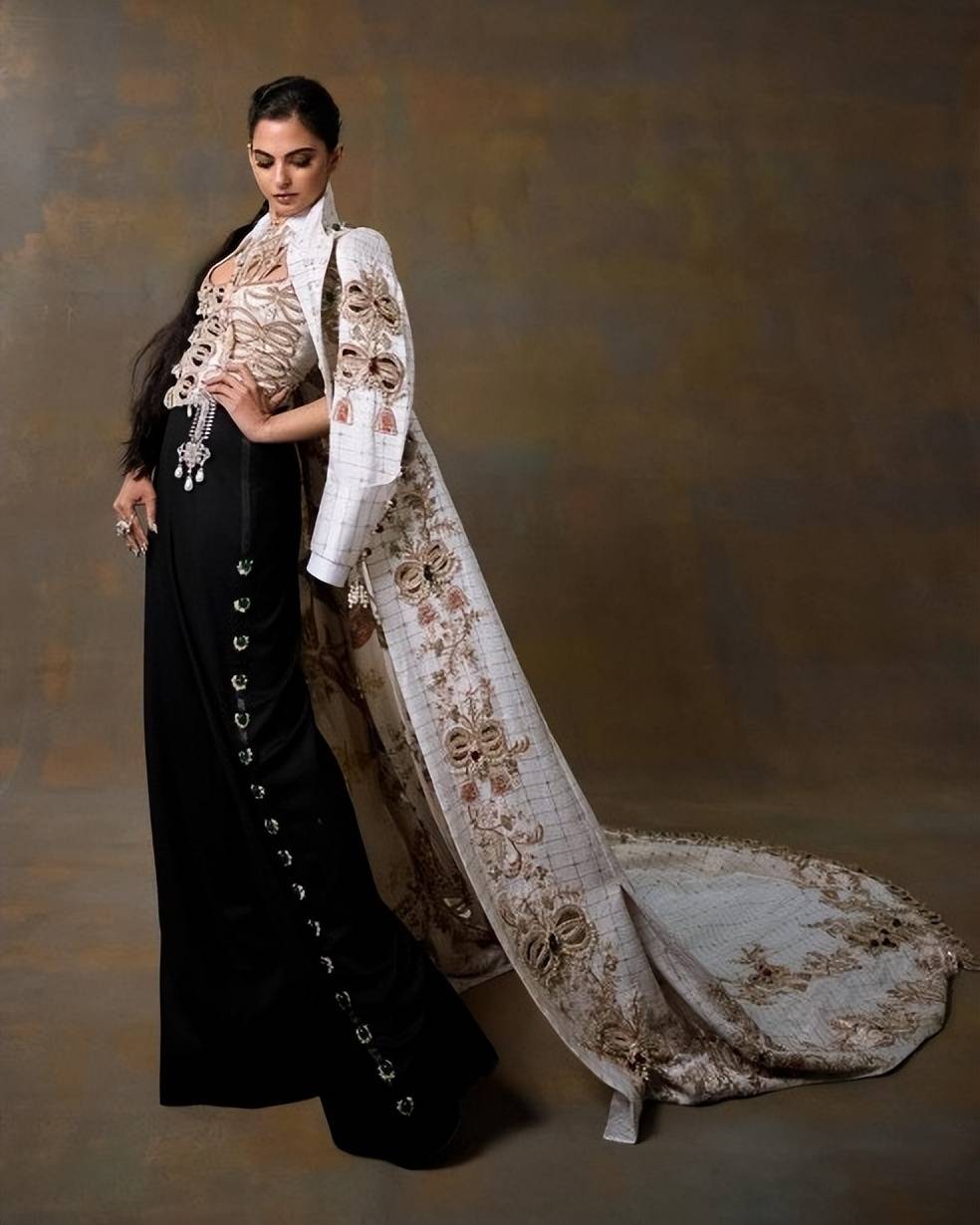 这件衣服是印度知名设计师为她设计的,上面有大量的印度传统刺绣,上面还点缀着数颗漂亮的宝石。